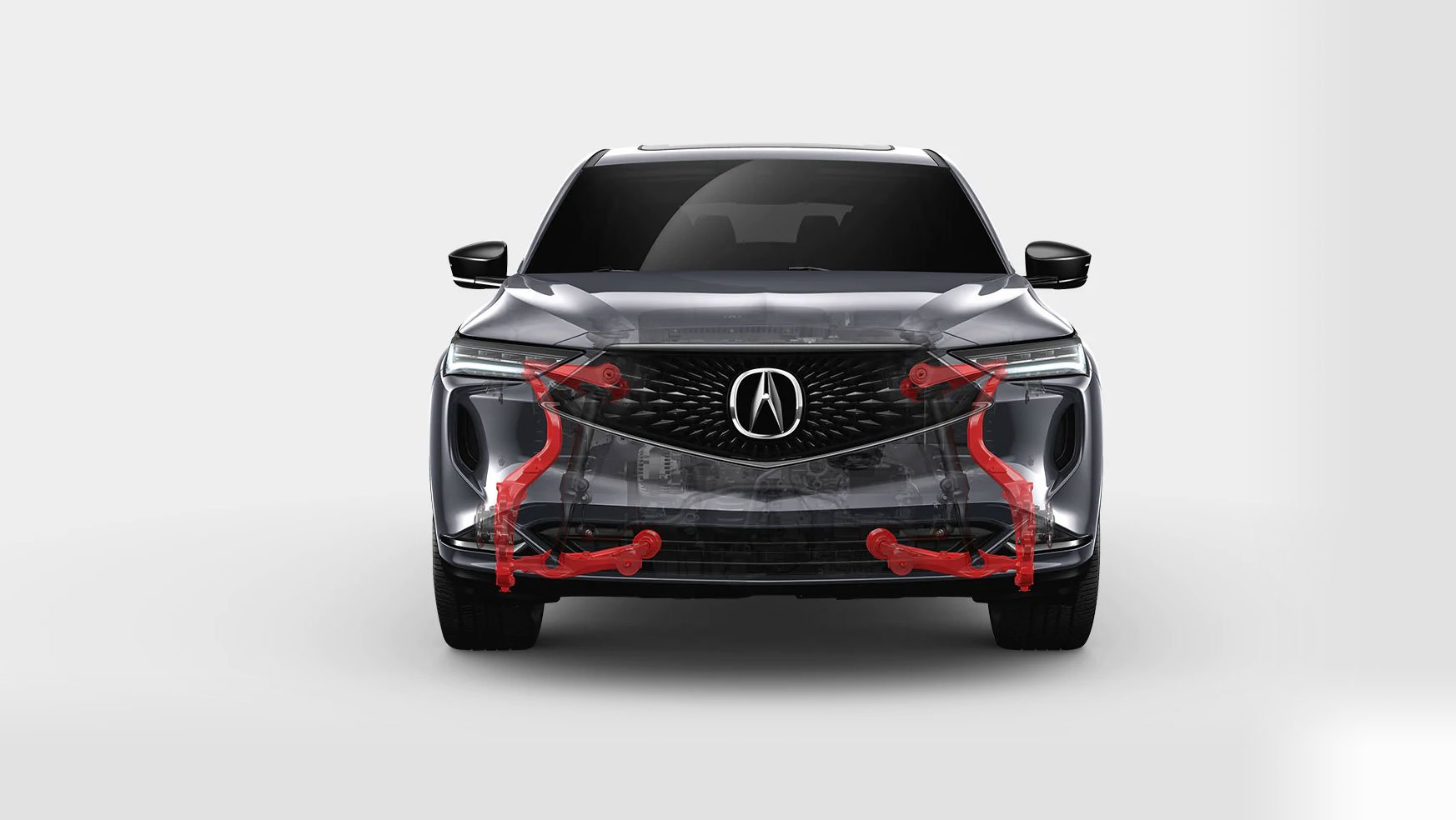 La nueva suspensión delantera de doble horquilla mantiene el MDX pegado al suelo con ruedas más grandes y anchas para lograr una maniobrabilidad con gran capacidad de respuesta, incluso cuando se lo lleva al límite.